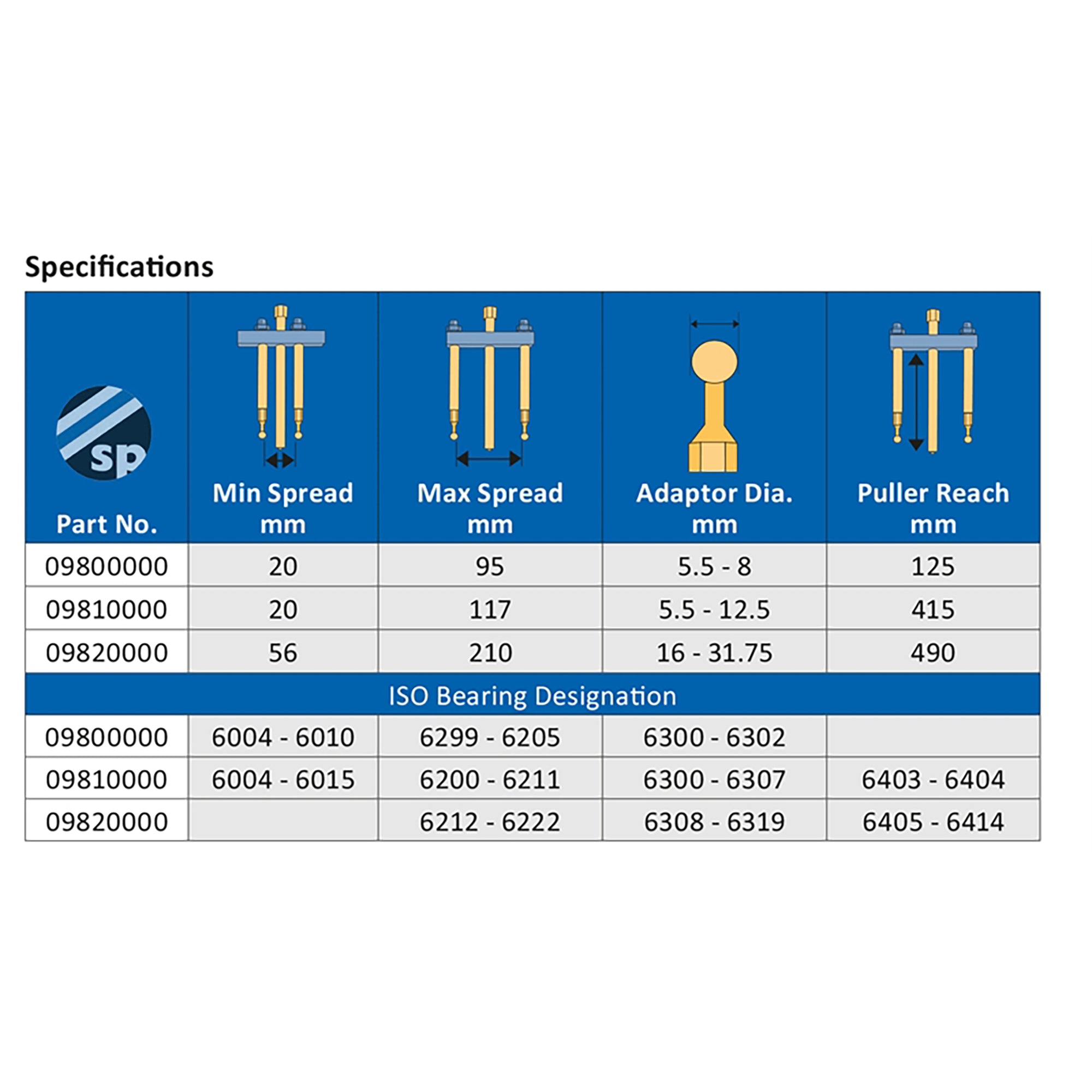 • 3 kits cover a wide range of ISO bearings. (To identify kit for bearings without an ISO reference, refer to puller spread and adaptor diameter).